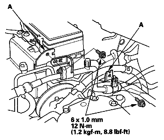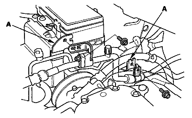 7. Remove the harness bracket (A), then disconnect the A/C compressor clutch connector (B).