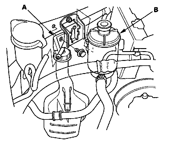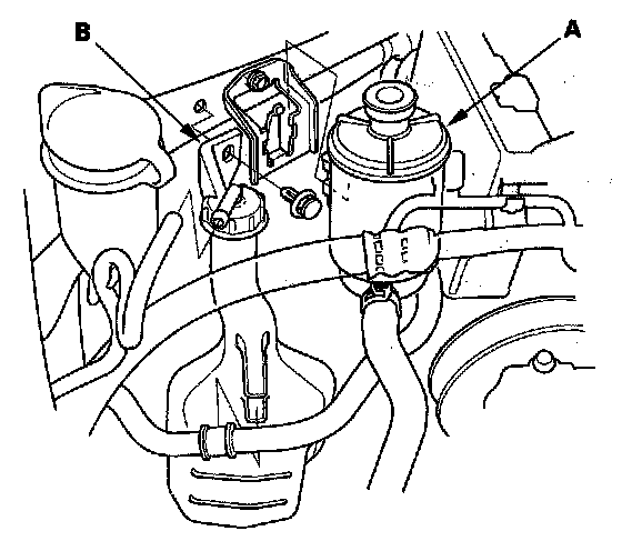 6. Remove the coolant reservoir (A), then remove power steering fluid reservoir (B) from the bracket.