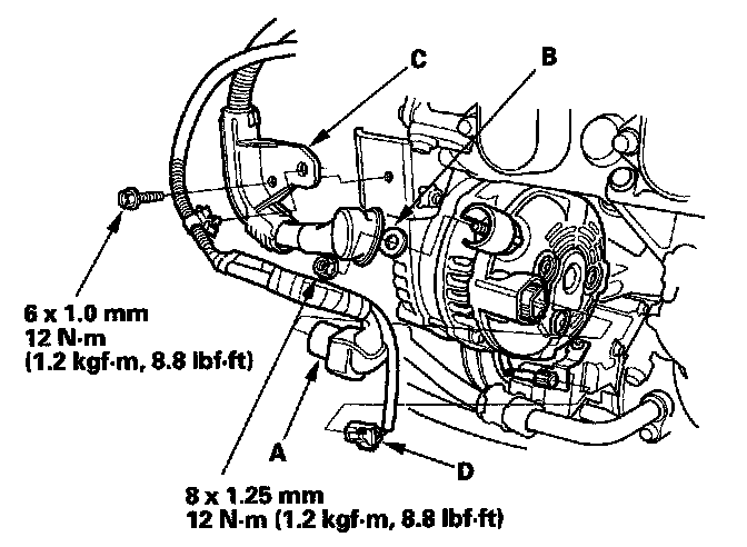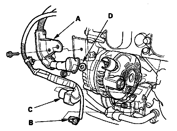 8. Disconnect the alternator connector (C) and the BLK wire (D) from the alternator.