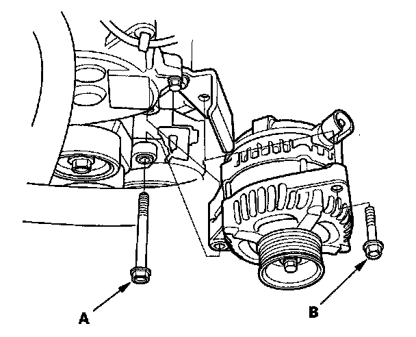 9. Remove the mounting bolt (A) and alternator bracket mounting bolt (B), then remove the alternator.