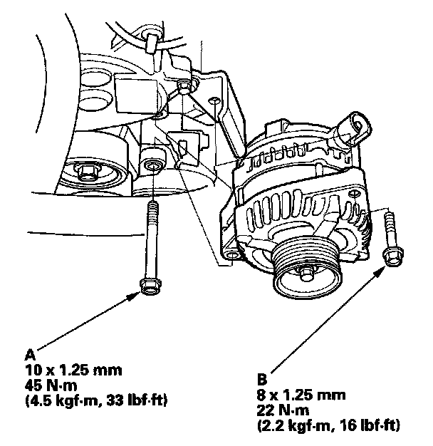1. Install the alternator, and tighten the mounting bolt (A) and bracket mounting bolt (B).