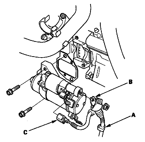 6. Disconnect the positive starter cable (B) from the B terminal, then disconnect the connector (C) from the S terminal.