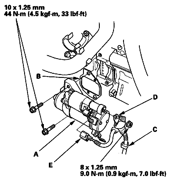 1. Install the starter (A) using a new gasket (B), then install the harness clamp (C), and positive starter cable (D) and S terminal connector (E). Make sure the crimped side of the B terminal is facing out, away from the starter.