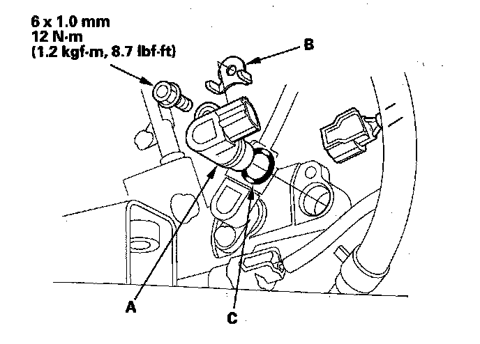 5. Install the new O-ring (C) on the new output shaft (countershaft) speed sensor (B), then install the output shaft (countershaft) speed sensor and sensor washer.