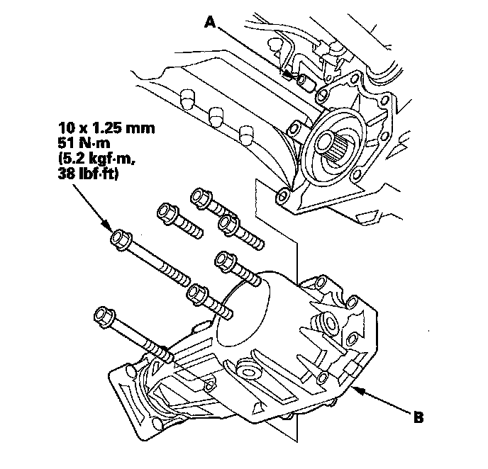 2. Install the dowel pin (A) in the transmission, and install the transfer assembly (B) on the transmission.