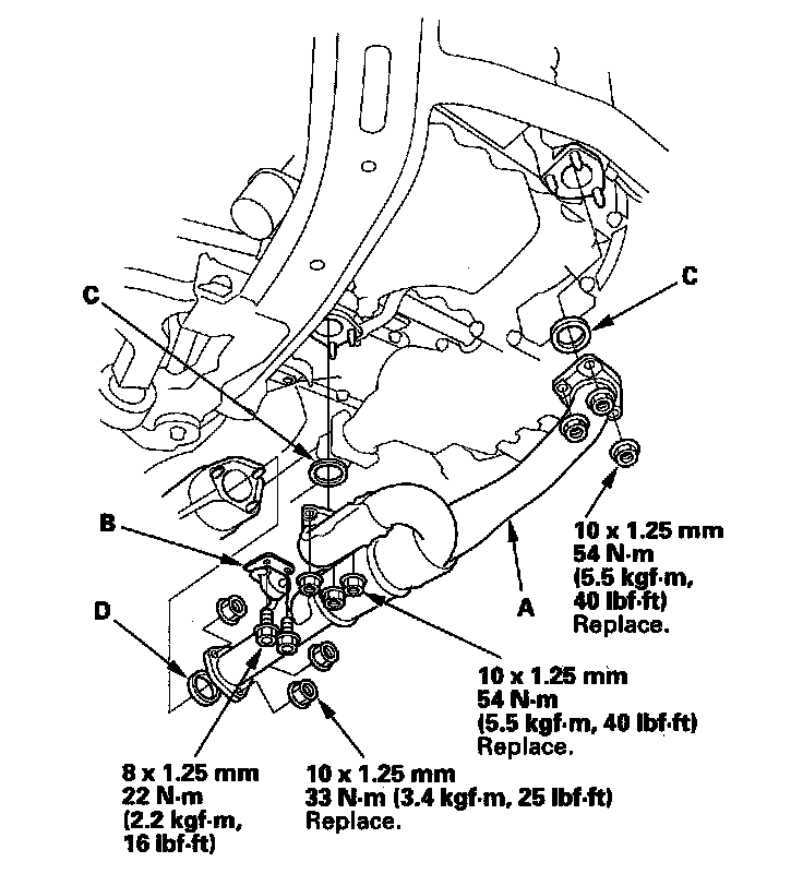 5. Install exhaust pipe A with the new self-locking nuts, its mount (B), and new gaskets (C) (D).