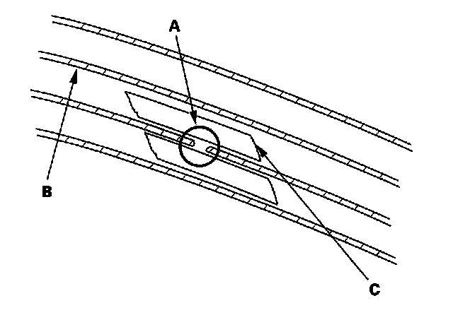 2. Carefully mask above and below the broken portion of the defogger wire (B) with cellophane tape (C).