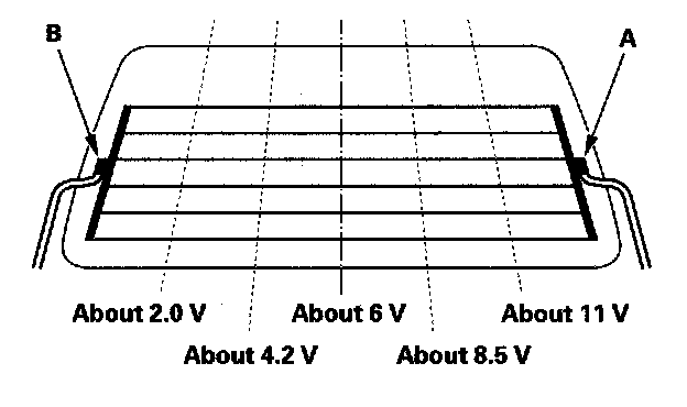 1. Measure the voltage between the positive terminal (A) and body ground with the ignition switch and defogger switch ON. There should be battery voltage.