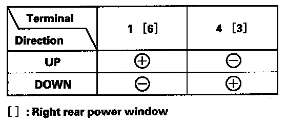 2. Test the power window motor in each direction by connecting battery power and ground according to the table. When the motor stops running, disconnect one lead immediately.