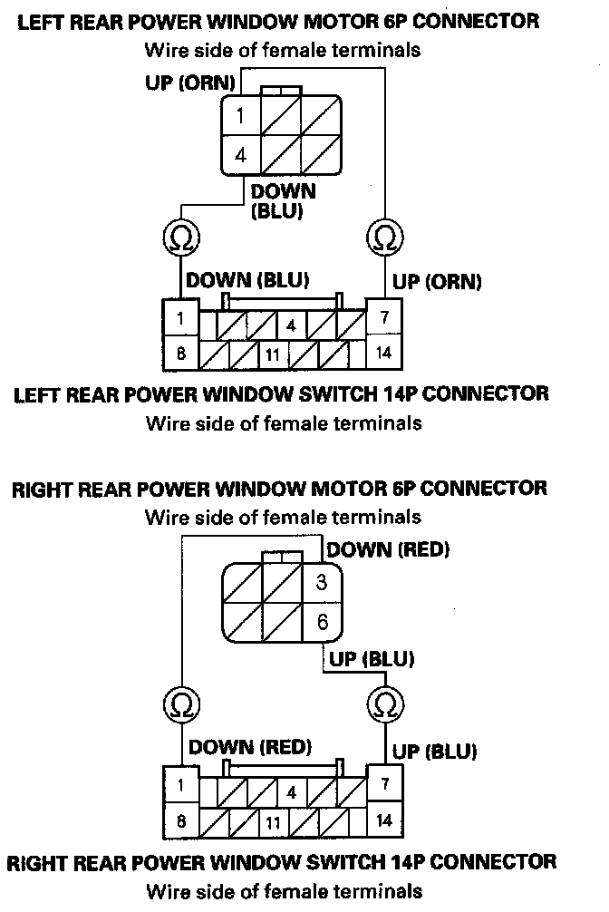 5. Check for continuity between the rear power window motor 6P connector No. 1 [No. 3] and No. 4 [No. 6] terminals and the front rear power window switch 14P connector No. 1 and No. 7 terminals respectively. There should be continuity.