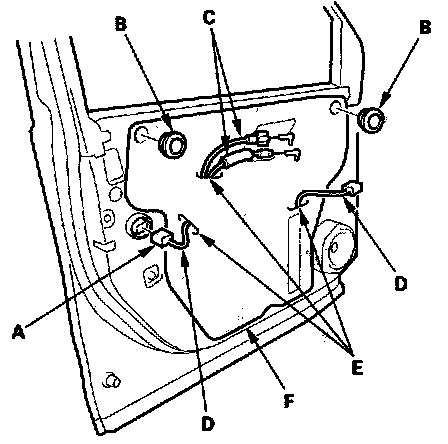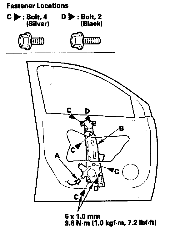 6. Remove the bolts (C), and loosen the bolts (D), then remove the regulator through the hole in the door.