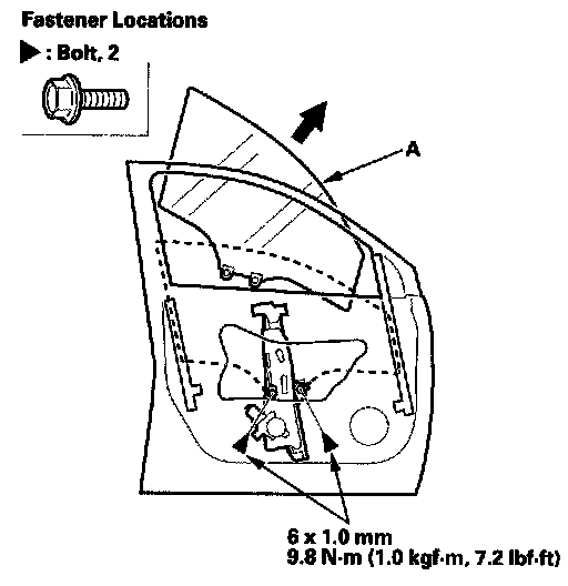 4. Carefully raise the glass (A) until you can see the bolts, then remove them. Carefully pull the glass out through the window slot. Take care not to drop the glass inside the door.
