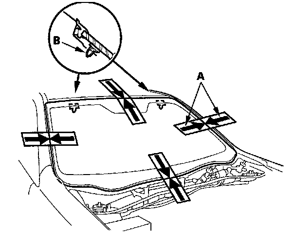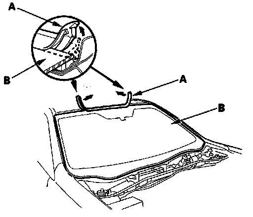 2. Remove the molding (A) from the upper edge of the windshield (B). If necessary, cut the molding with a utility knife.