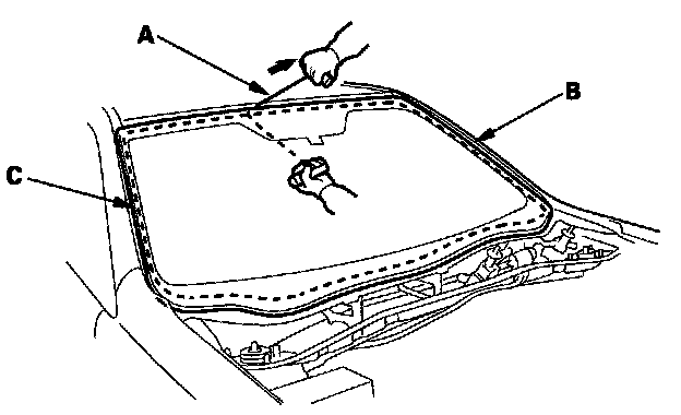 6. With a helper on the outside, pull the piano wire (A) back and forth in a sawing motion. Hold the piano wire as close to the windshield (B) as possible to prevent damage to the body and dashboard. Carefully cut through the rubber dam and adhesive (C) around the entire windshield.