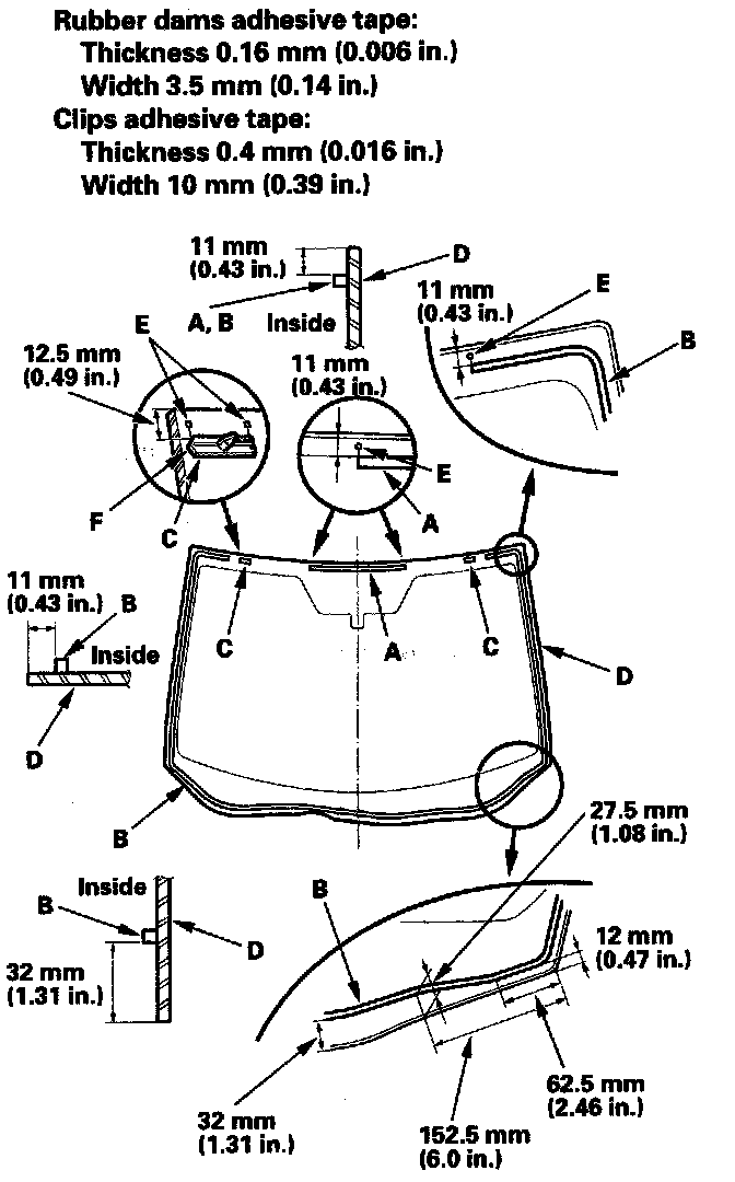 11. Attach the upper rubber dam (A), lower rubber dam (B), and clips (C) with adhesive tape to the inside face of the windshield (D) as shown: