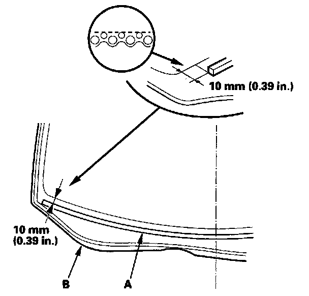 14. Attach the molding upper seal (A) with adhesive tape to the inside surface of the molding (B) as shown.