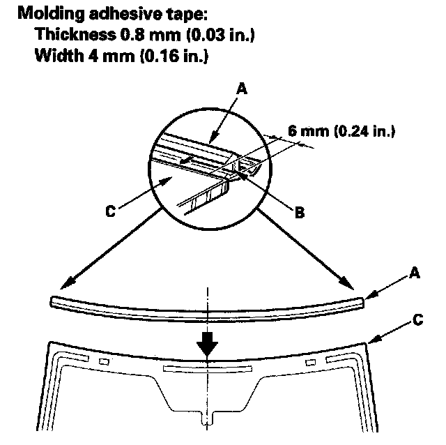 13. Attach the molding (A) with adhesive tape (B) to the upper edge of the windshield (C). Be careful not to touch the windshield where adhesive will be applied.