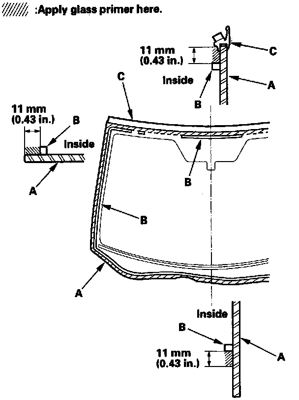 17. With a sponge, apply a light coat of glass primer around the edge of the windshield (A) between the dams (B) and molding (C) as shown, then lightly wipe it off with gauze or cheesecloth:
