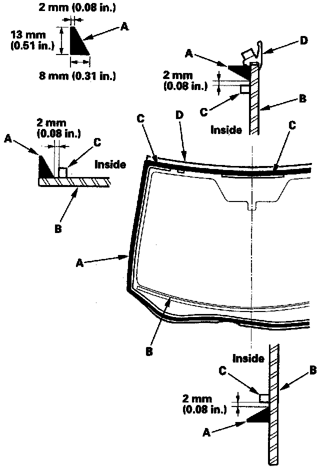 20. Pack adhesive into the cartridge without air pockets to ensure continuous delivery. Put the cartridge in a caulking gun, and run a bead of adhesive (A) around the edge of the windshield (B) between the dams (C) and molding (D) as shown. Apply the adhesive within 30 minutes after applying the glass primer. Make a slightly thicker bead at each corner.