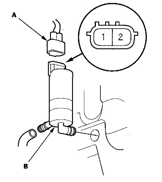 3. Test the motor by connecting battery power to the headlight washer motor 2P connector No. 1 terminal and ground to the No. 2 terminal. The motor should run.