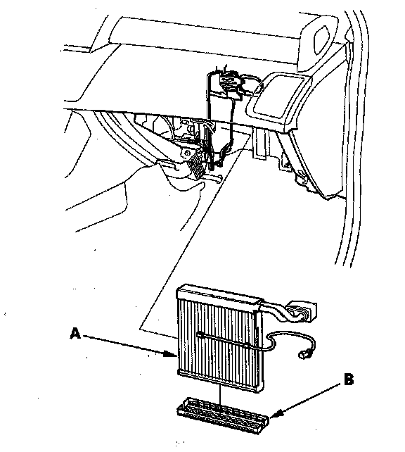 7. Carefully pull out the evaporator core (A) without bending the lines, then remove the plate (B).