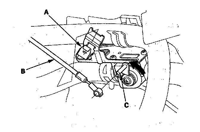 5. From under the hood, open the cable clamp (A), then disconnect the heater valve cable (B) from the heater valve arm (C). Turn the heater valve arm to the fully opened position as shown.