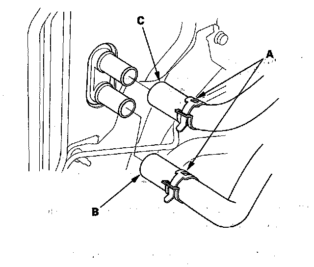 7. From under the hood, slide the hose clamps (A) back. Disconnect the inlet heater hose (B) and the outlet heater hose (C) from the heater unit. Note the orientation of the hose.