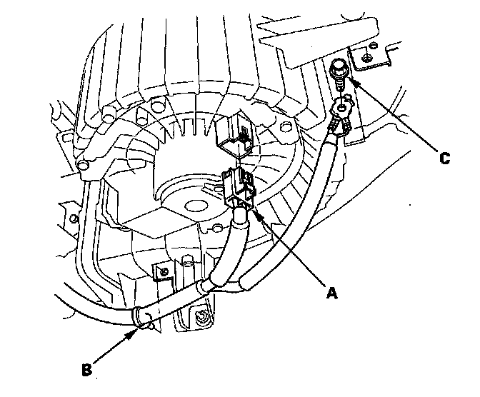 10. Disconnect the connector (A) from the blower motor. Remove the wire harness clip (B) and ground terminal bolt (C).