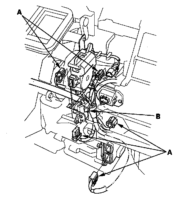12. Disconnect the connectors (A) from the climate control unit, mode control motor, passenger's air mix motor, the evaporator temperature sensor, and the power transistor. Remove the wire harness clip (B).