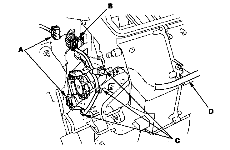 13. Disconnect the connectors (A) from the driver's air mix control motor and A/C wire harness. Remove the connector clip (B), the wire harness clips (C), and the wire harness (D).
