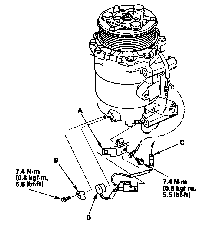 A/C Compressor Thermal Protector Replacement1. Remove the bolt and the stay (A), and remove the bolt and the holder (B). Disconnect the field coil connector (C), then detach the harness clip and remove the thermal protector (D).