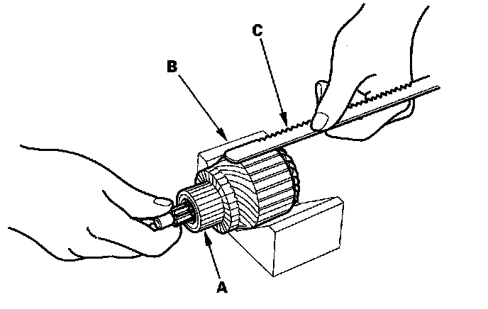 9. Place the armature (A) on an armature tester (B). Hold a hacksaw blade (C) on the armature core. If the blade is attracted to the core or vibrates while the core is turned, the armature is shorted. Replace the armature.