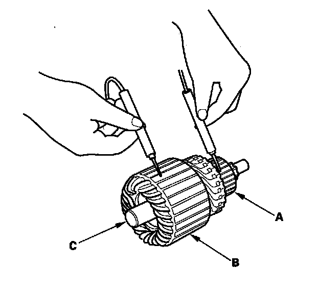 10. Use an ohmmeter to check for continuity between the commutator (A) and the armature coil core (B), and between the commutator and the armature shaft (C). If there is continuity, replace the armature.