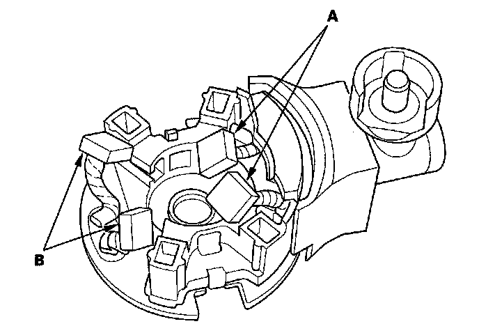 12. Check for continuity between the (+) brush (A) and (-) brush (B). If there is continuity, replace the brush holder assembly.