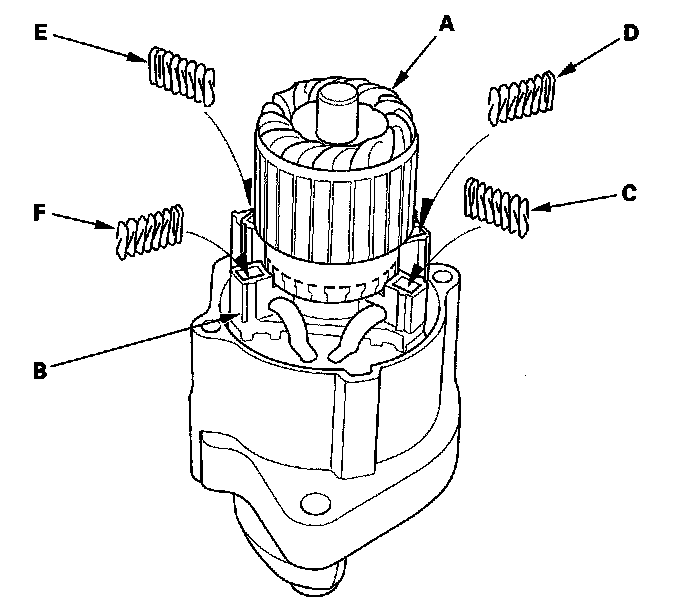 18. While squeezing a spring (C), insert it in the hole on the brush holder, and push it until it bottoms. Repeat this for the other three springs (D, E, and F).