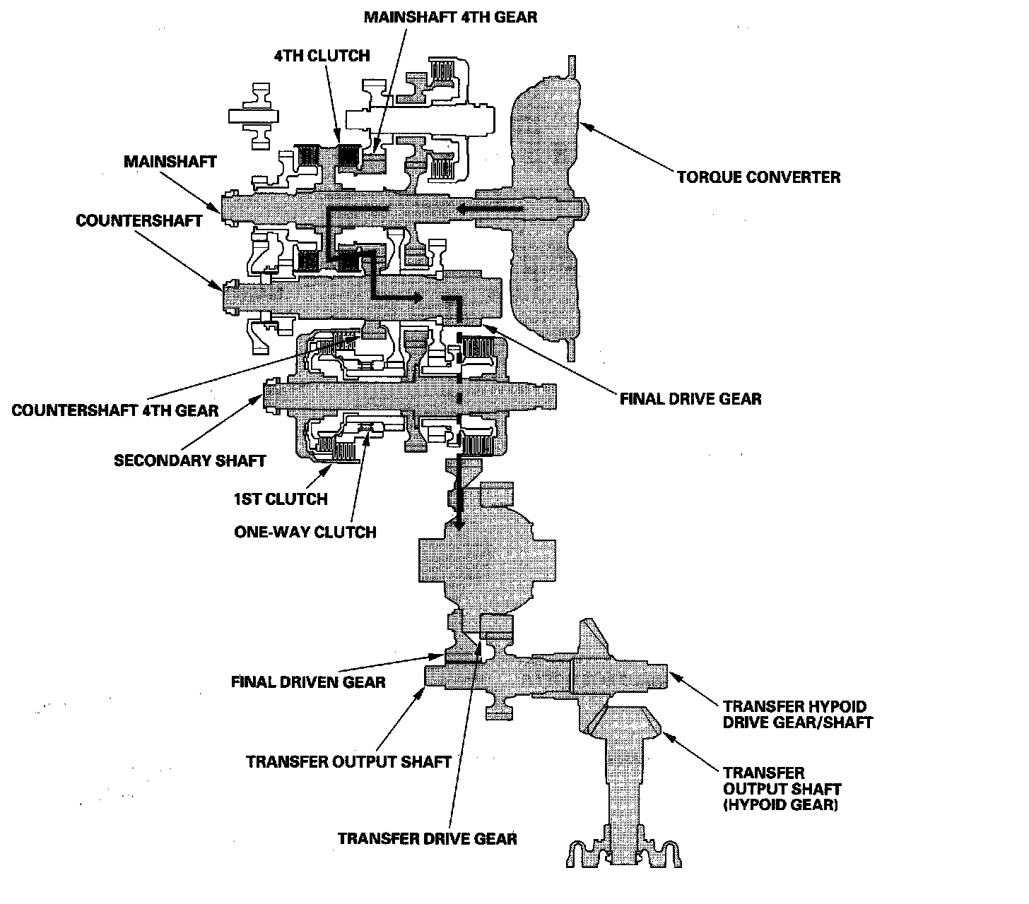 ^ Hydraulic pressure is applied to the 4th clutch, then the 4th clutch engages the mainshaft 4th gear with the mainshaft.