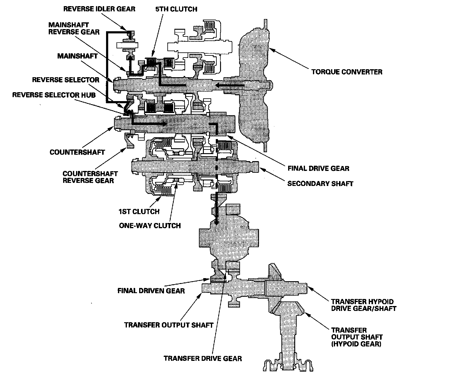 ^ Hydraulic pressure is applied to the 5th clutch, then the 5th clutch engages the mainshaft reverse gear with the mainshaft.