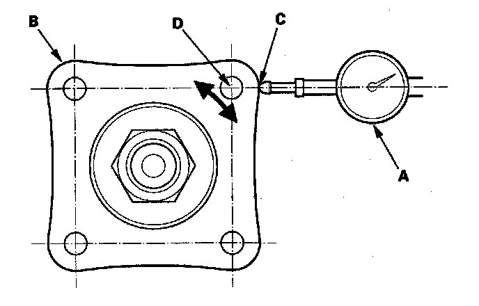5. Set a dial indicator (A) on the transfer companion flange (B); position dial indicator tip (C) on the direct extension of the bolt hole center (D).