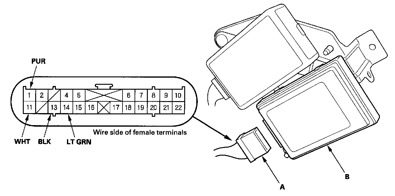 2. Disconnect the 22P connector (A) from the HandsFreeLink control unit (B).