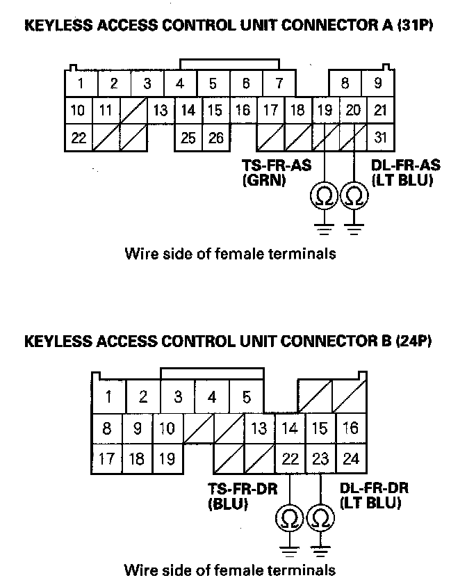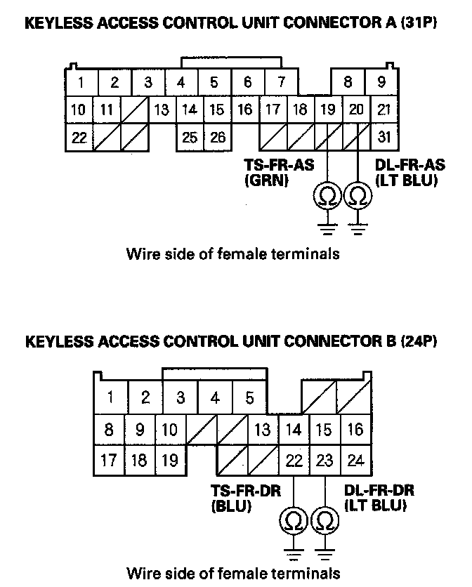 15. Check for continuity between keyless access control unit connector A (31P) terminals No. 19 and No. 20 and body ground (for front passenger's door touch sensor), or between keyless access control unit connector B (24P) terminals No. 22 and No. 23 and body ground (for driver's door touch sensor).