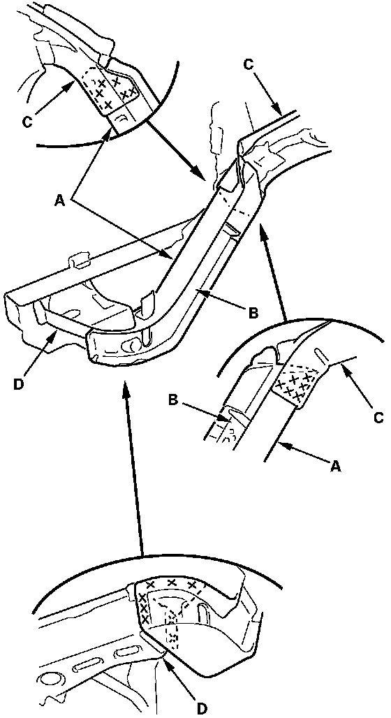 6. Weld the front wheelhouse lower extension (A) and lower member (B) to the wheelhouse upper member (C) and front side gusset (D).