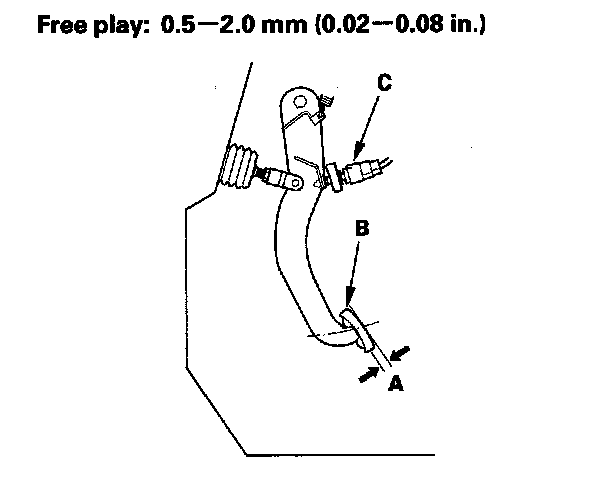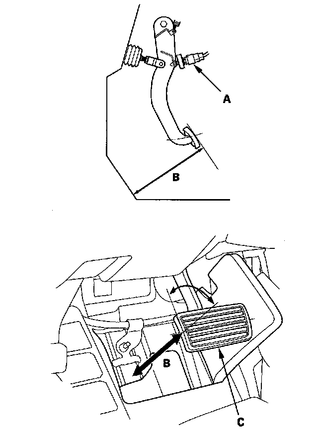 2. If the brake pedal free play is out of specification, adjust the brake pedal position switch (C). If the brake pedal free play is insufficient, it may result in brake drag.
