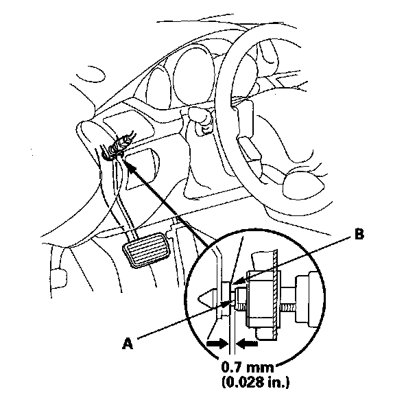 4. Lift up on the brake pedal by hand. Push in the brake pedal position switch until its plunger is fully pressed (threaded end (A) touching the pad (B) on the pedal arm). Then, turn the switch 45° clockwise to lock it. The gap between the brake pedal position switch and the pad is automatically adjusted to 0.7 mm (0.028 in.) by locking the switch. Make sure the brake lights go off when the pedal is released.