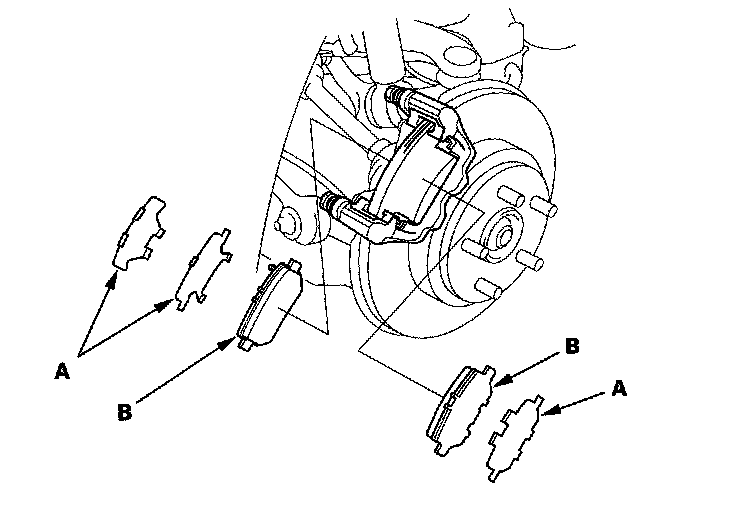 3. Check the thickness of the inner brake pad (A) and outer pad (B). Do not include the thickness of the backing plate.