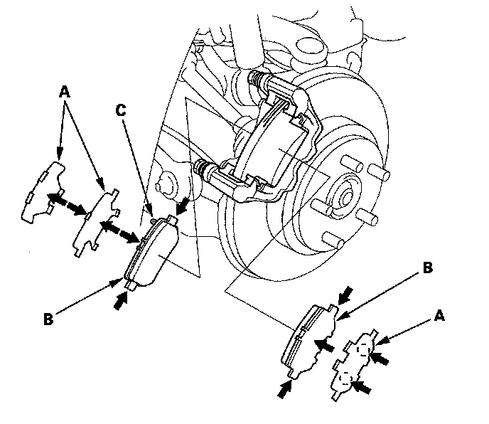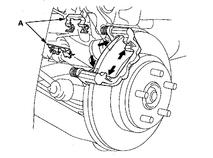 ^ If you are reusing the brake pads, always reinstall the brake pads in their original positions to prevent a momentary loss of braking efficiency.