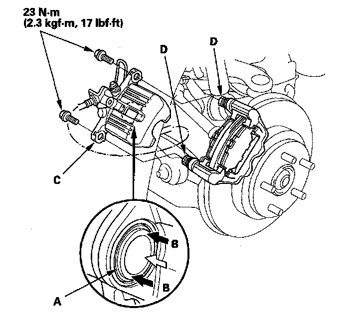 18. Install the caliper bolts, and torque them to the specified torque while holding the caliper pins (D) with a wrench being careful not to damage the pin boot.