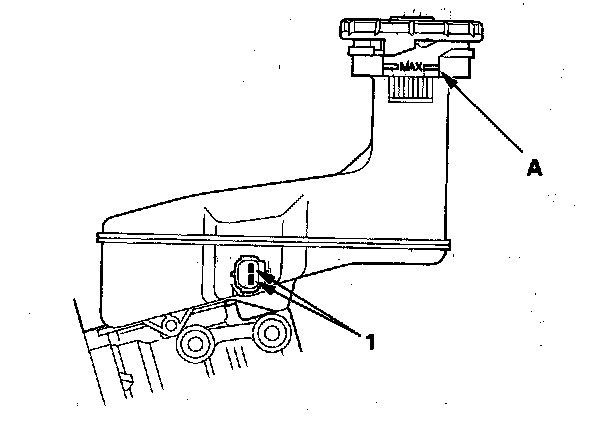 ^ Fill the reservoir with brake fluid to the MAX (upper) level (A). With the float up, there should be no continuity.