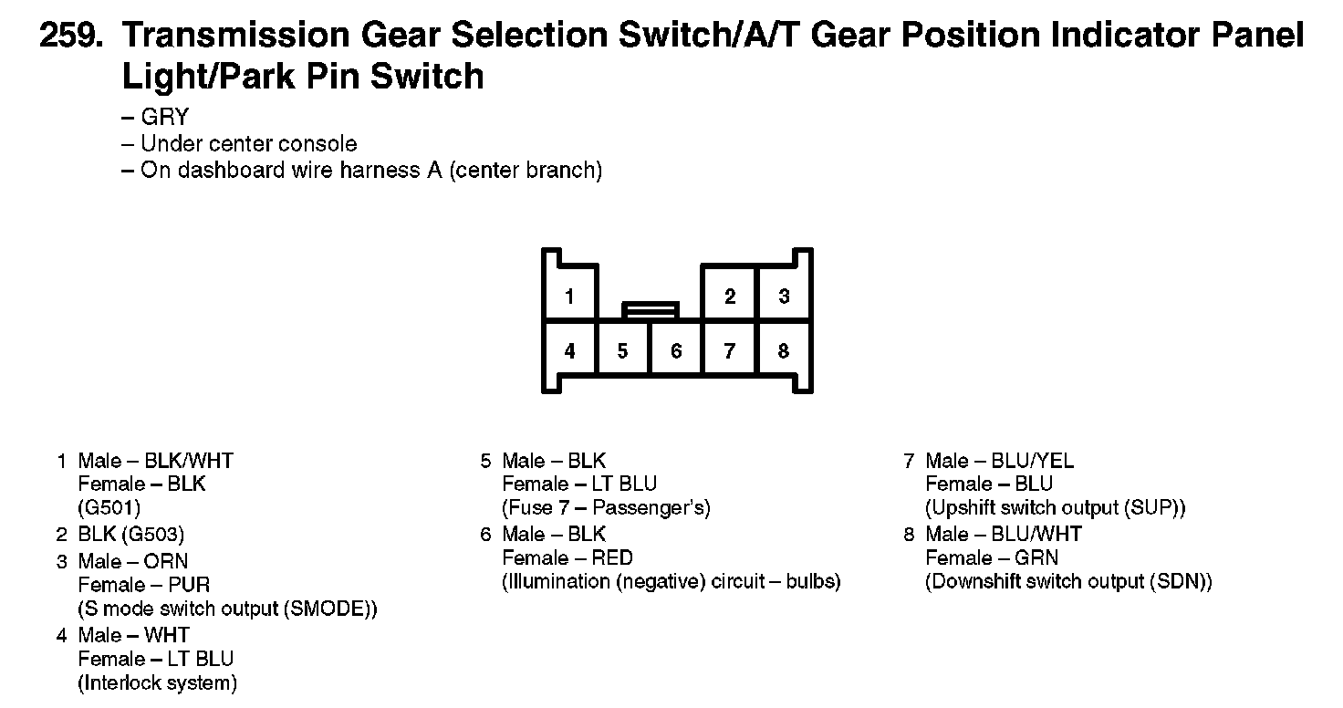 259. Transmission Gear Selection Switch/A/T Gear Position Indicator Panel Light/Park Pin Switch: