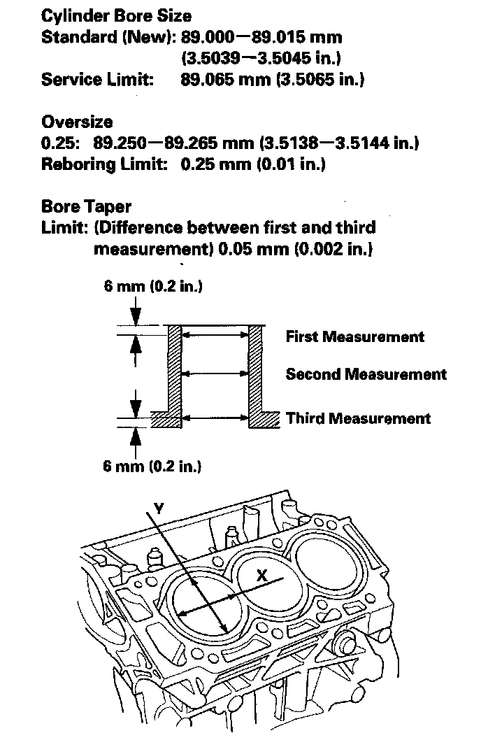 4. Measure wear and taper in direction X and Y at three levels in each cylinder as shown. If measurements in any cylinder are beyond the oversize bore service limit, replace the block. If the block has to be rebored, refer to step 7 after reboring.