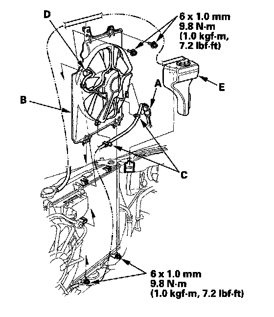 6. Remove the A/C compressor clutch connector (A) from the A/C condenser fan shroud (B). Remove the clips (C). Disconnect the connector (D) from the radiator fan control unit. Loosen the lower mounting bolts, then remove the upper mounting bolts. Detach the reserve tank (E) from the frame. Remove the A/C condenser fan shroud. Be careful not to damage the radiator fins when removing the A/C condenser shroud.